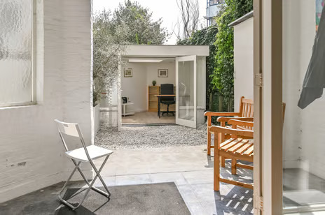 The beautifully landscaped south-facing garden is a true highlight—sunny, private, and featuring a separate insulated studio/office with water, electricity, and electric heating. Perfect as a home office, guest room or creative workspace.