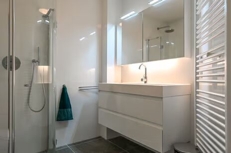 The third bedroom is located at the front of the house. The modern bathroom includes a walk-in rain shower, stylish vanity, second toilet, electric underfloor heating, and a designer radiator. There’s also a separate laundry room with sink and connections for a washing machine and dryer, plus a handy storage room.
