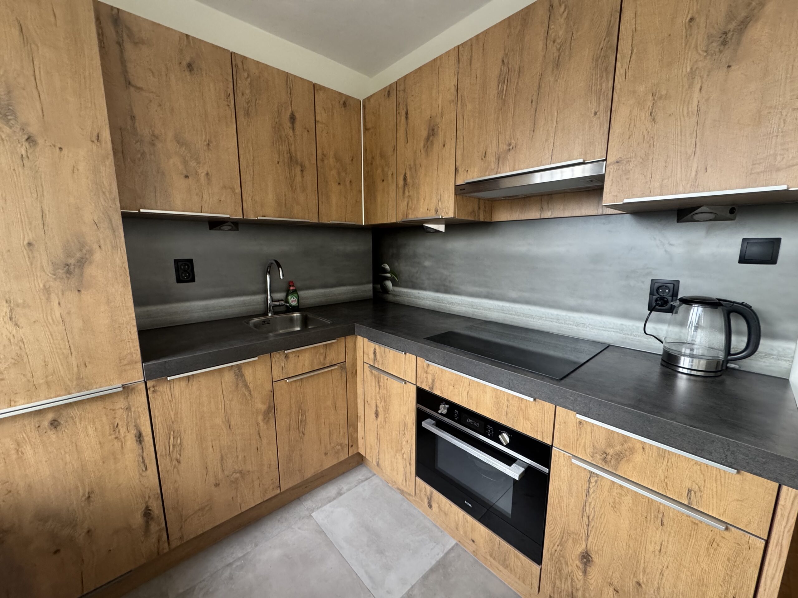 Entrance, hallway, second bedroom on the right and the brand new separate kitchen is situated on the left. The kitchen is provided with several appliances, such as refrigerator, freezer, dishwasher, stove and microwave/oven.