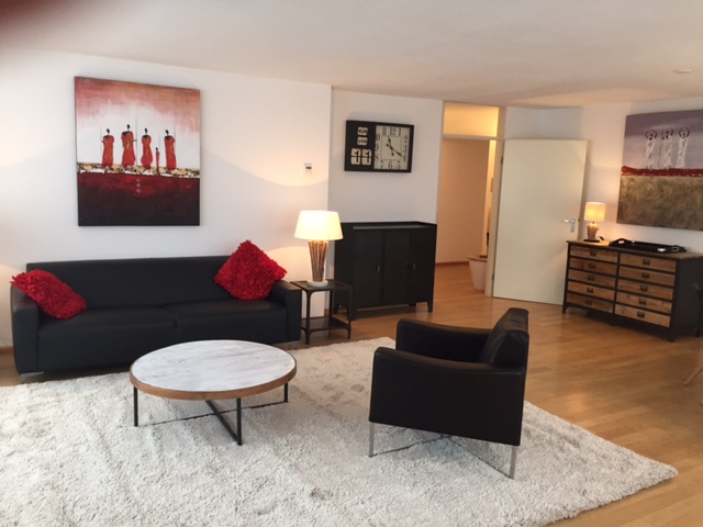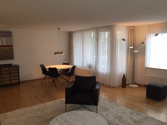 The fully furnished apartment is accessible via elevator or the stairs. Via the entrance hall you reach the open plan living and dining area. Separate kitchen containing all modern appliances, 2 bedrooms: a double great for a master and also a generous single bedroom, bathroom with full bathtub and walk in shower, laminate flooring throughout the whole apartment and a total living space of 105 m2.