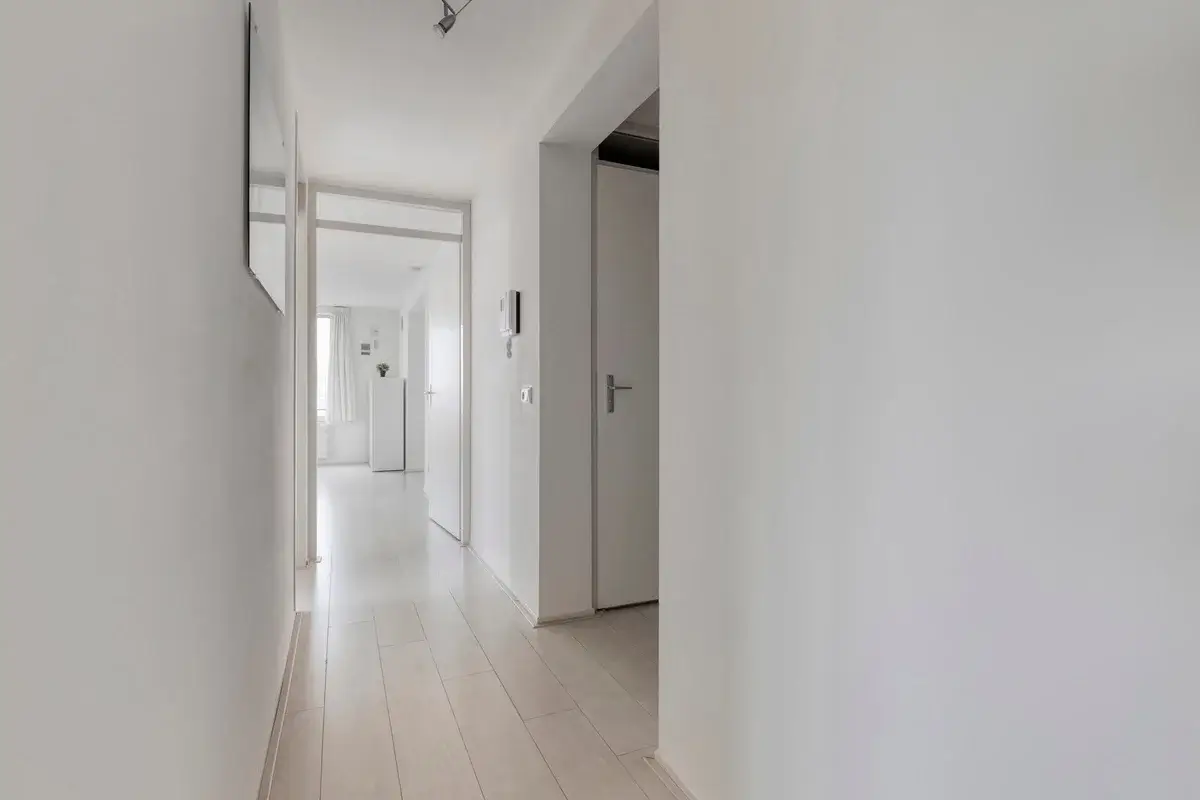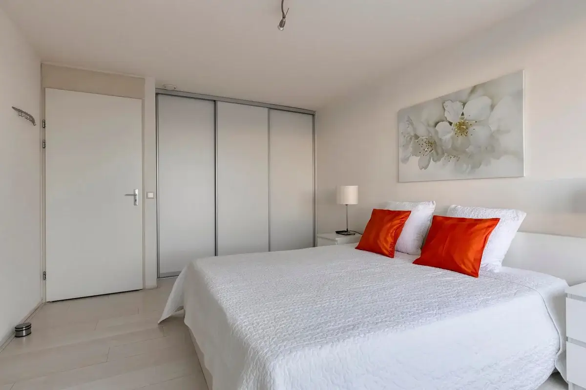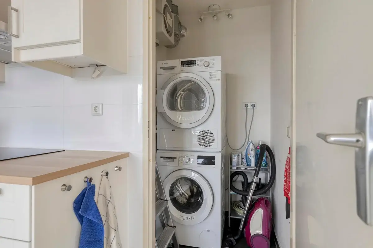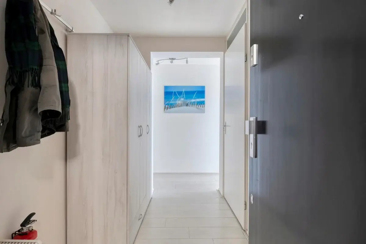 Apartment entrance. From the hall, you have access to all rooms, including the living room with a stunning view, a spacious open-plan kitchen equipped with various built-in appliances and a dining table. From the hall, you also have access to two spacious bedrooms, one with a double bed and the other with a single bed and ample closet space. A neat bathroom with a sink, walk-in shower, bathtub, designer radiator, and a washing machine and dryer are also located there.