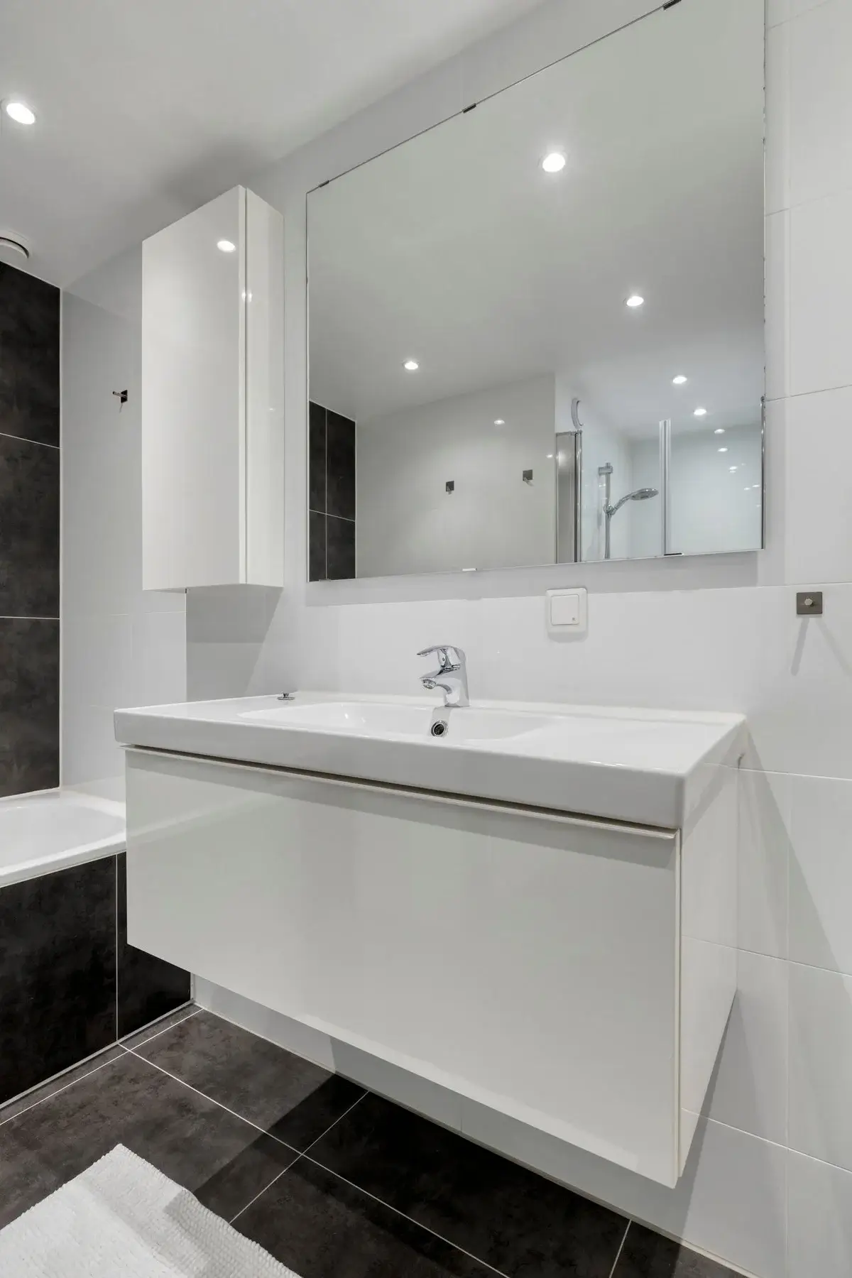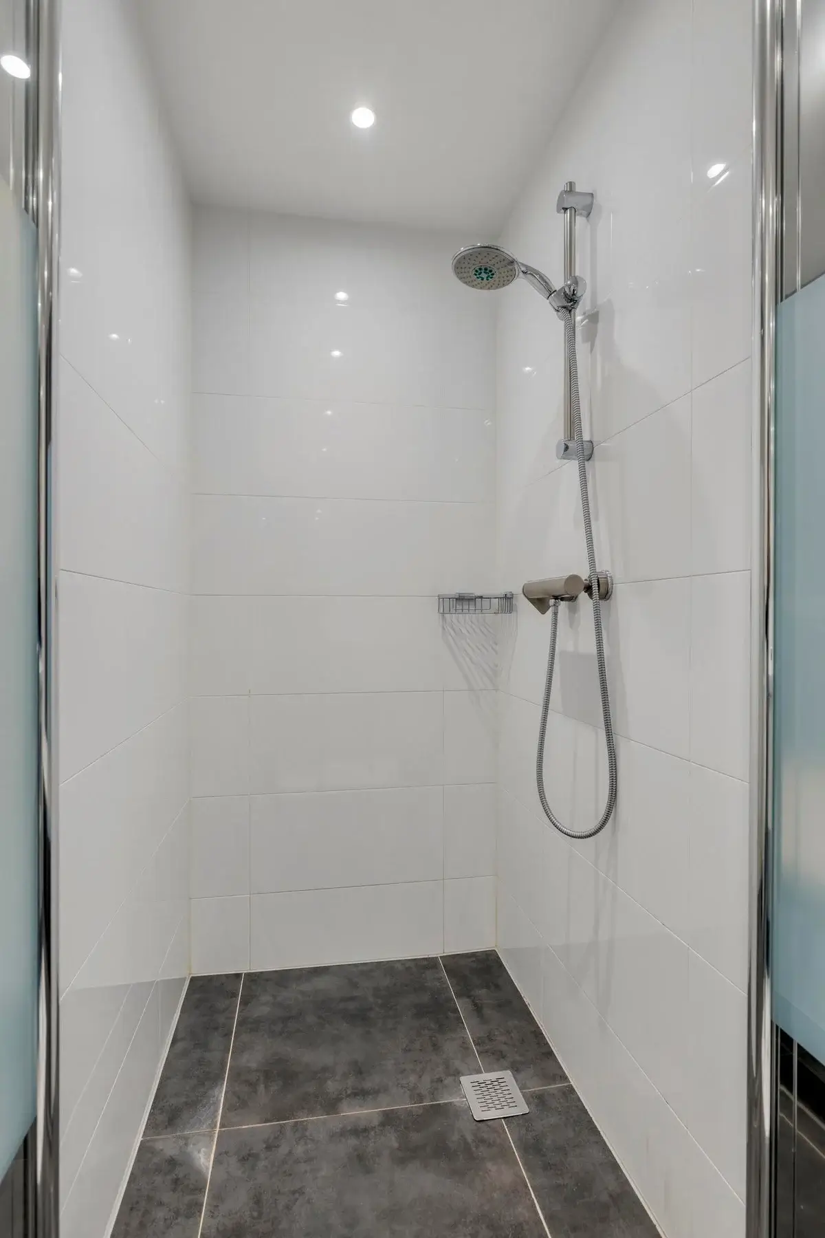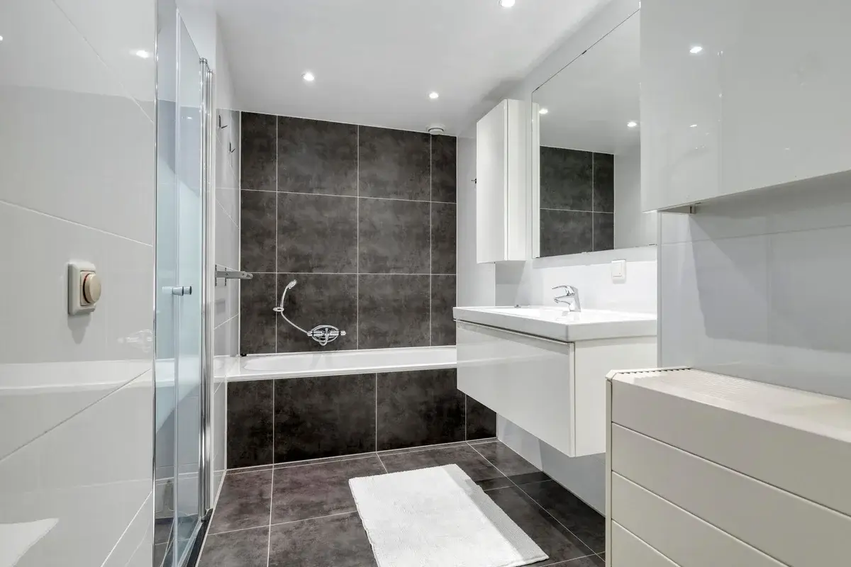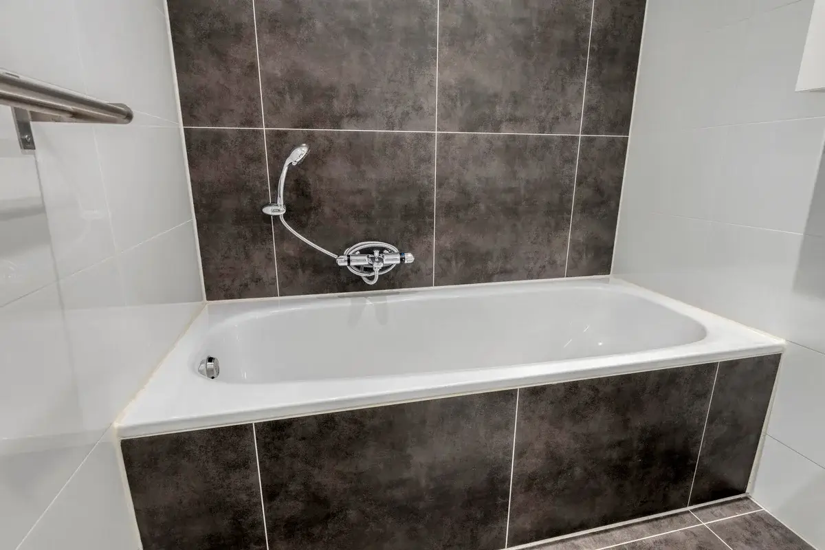 Apartment entrance. From the hall, you have access to all rooms, including the living room with a stunning view, a spacious open-plan kitchen equipped with various built-in appliances and a dining table. From the hall, you also have access to two spacious bedrooms, one with a double bed and the other with a single bed and ample closet space. A neat bathroom with a sink, walk-in shower, bathtub, designer radiator, and a washing machine and dryer are also located there.