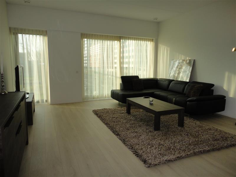 アムステルダム南Zuidasのモダンなフラット。電車駅Amsteradam Zuidが目の前。この駅からスキポール空港まで一駅6分。明るい居間、オープンキッチン、2寝室、浴室はバスタブとシャワーが別。階下に物置。地下の駐車場を希望の場合は家賃とは別払いになる。