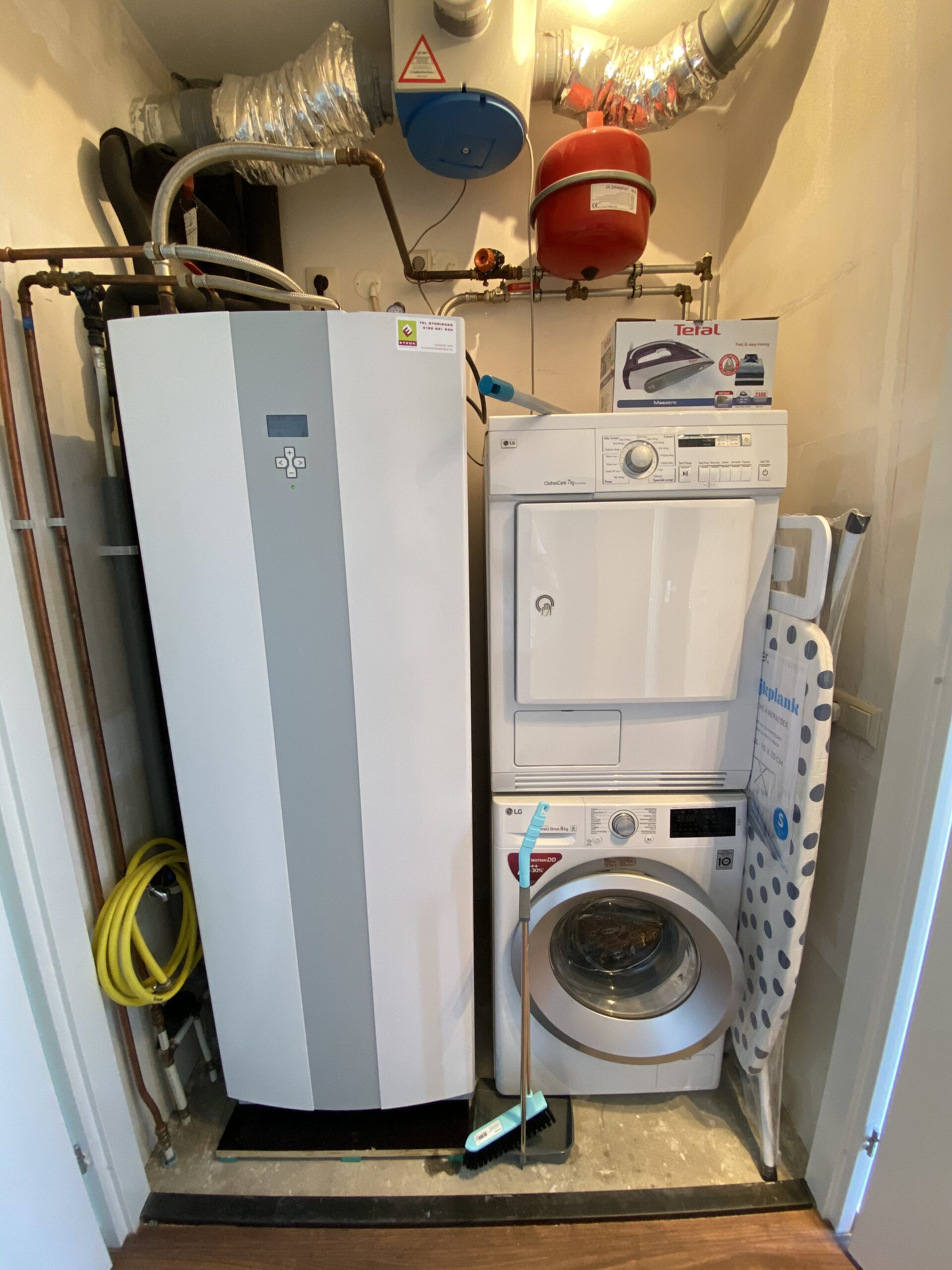 You enter the apartment through the entrance hall, which provides access to the meter cupboard, the washer and dryer storage area, the separate toilet, the bathroom, the spacious bedroom, and the large living room with an open-plan kitchen.